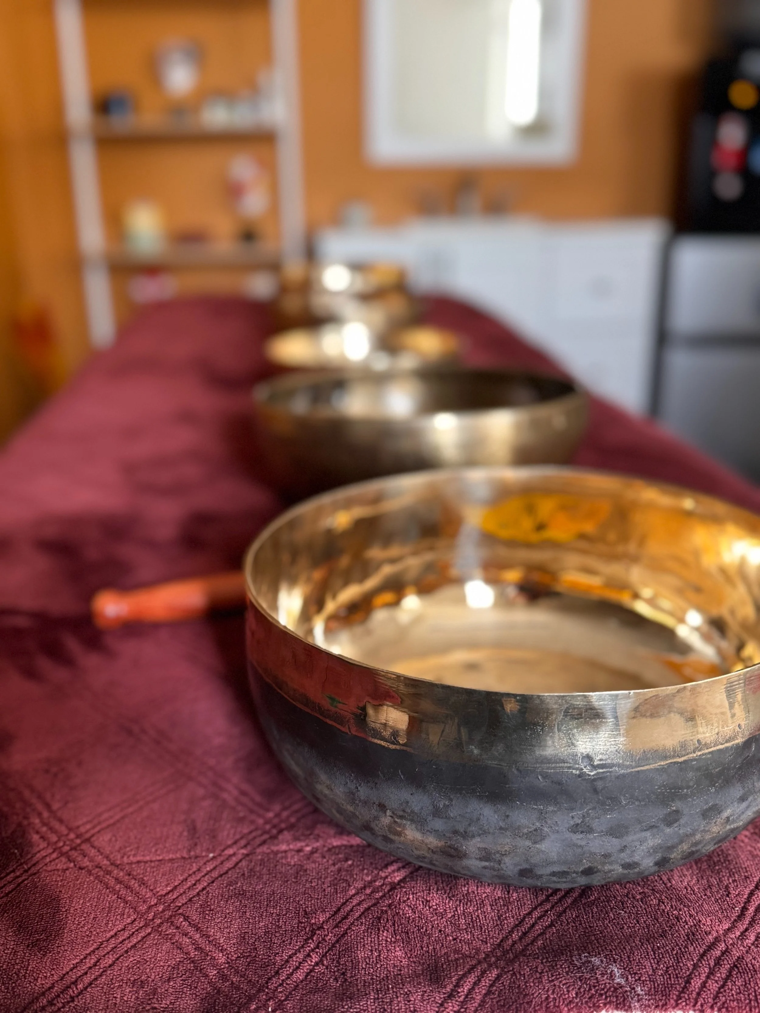 Laying on the table, bowls are placed around you, under you and ON YOU! For 30-35 minutes you are able to completely relax while the frequencies are holding you in a harmonic space of energy healing and deep transformation.